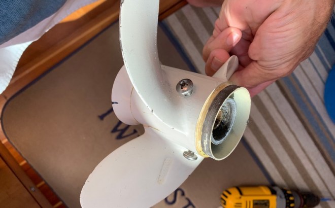 It is often joked that the definition of cruising is “making repairs in exotic places”. Fortunately our repairs are usually minor, such as this “spun prop” on our dinghy outboard. Since a replacement prop would be nearly impossible to obtain here, I found this quick fix on-line.