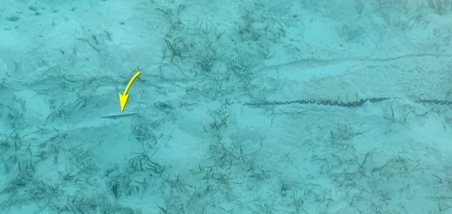 The Find Your Anchor Game – on wind-less mornings, you might drift next to your anchor. The arrow is showing all your can see of our anchor shank – it’s well dug in! Does this photo look fuzzy? Well, not when you consider you’re looking down 11ft.