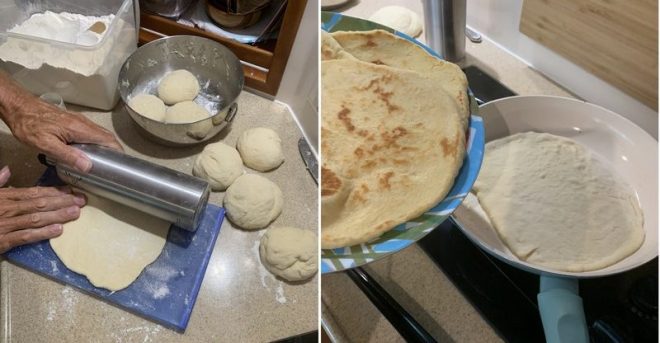 Bread products (especially this year), are difficult to obtain so we’ve added naan bread to our do-it-all-yourself list. Surprising simple – thanks Benj for your recipe!