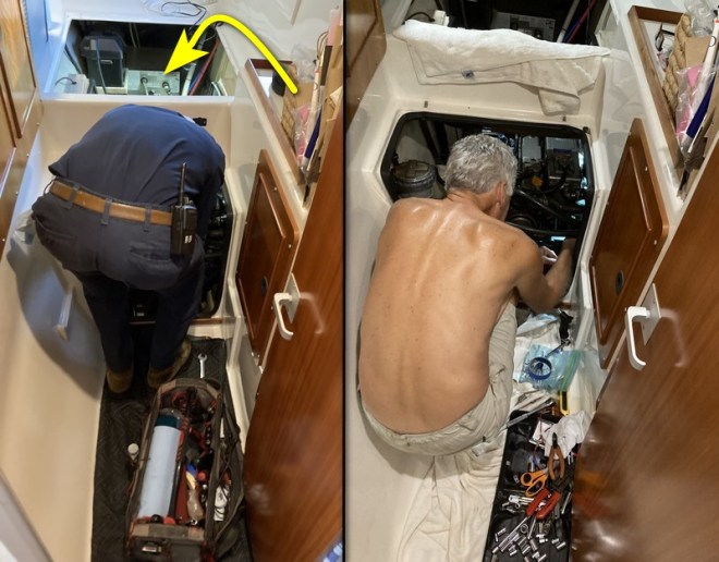 Bill (our mechanic) & myself taking turns working on the beast. These positions aren’t too bad, but most of the work was done down in the “hole” (yellow arrow). My tasks were very minor compared to Bill’s – such as removing & reinstalling the fuel injectors, re-locating the starter solenoids, replacing an alternator & replacing the water pump impellers.