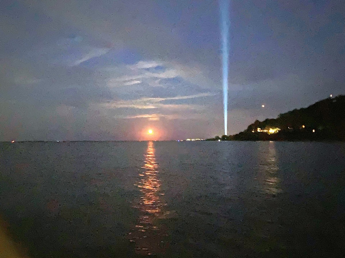 We are often anchored near NYC on 9/11 – very sobering. Beams of light from various points in NYC & in this case, NJ.