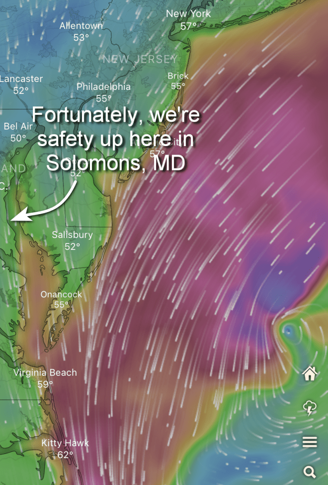 For 3 glorious days, our heat aboard blasted away while Mike & Ann provided a fantastic dinner, food shopping & even laundry! Like magic, on Thursday, the weather is forecasted to suddenly warm up with the big rains & winds coming to a halt. If so, we’ll be off to Hampton, Virginia, then thru Norfolk if the rains haven’t caused too much local flooding (some of the low bridges in that area flood which shuts down their openings until they can dry things out).