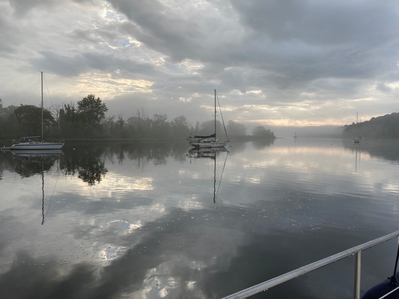 Every year in mid-September, Mother Nature suddenly throws the switch, letting us know we’re done with A/C & time to turn on the morning heat AND … time to leave! This was our morning view on departure day, but 1/2 hour later as we shoved off this was pea soup, but dissipated a few miles further down river.