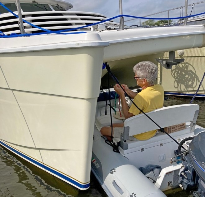While our chores & lack of a rental car somewhat limited visits with friends, one arrived by water – here’s Mike on “Easy Riders” – a PDQ similar to our old one. Ironically, this PDQ was the first one we ever went aboard, with a different owner down in Florida back in 2015.  Mike’s done a great job “restoring” Easy Riders – it was a little rough when we first saw her!