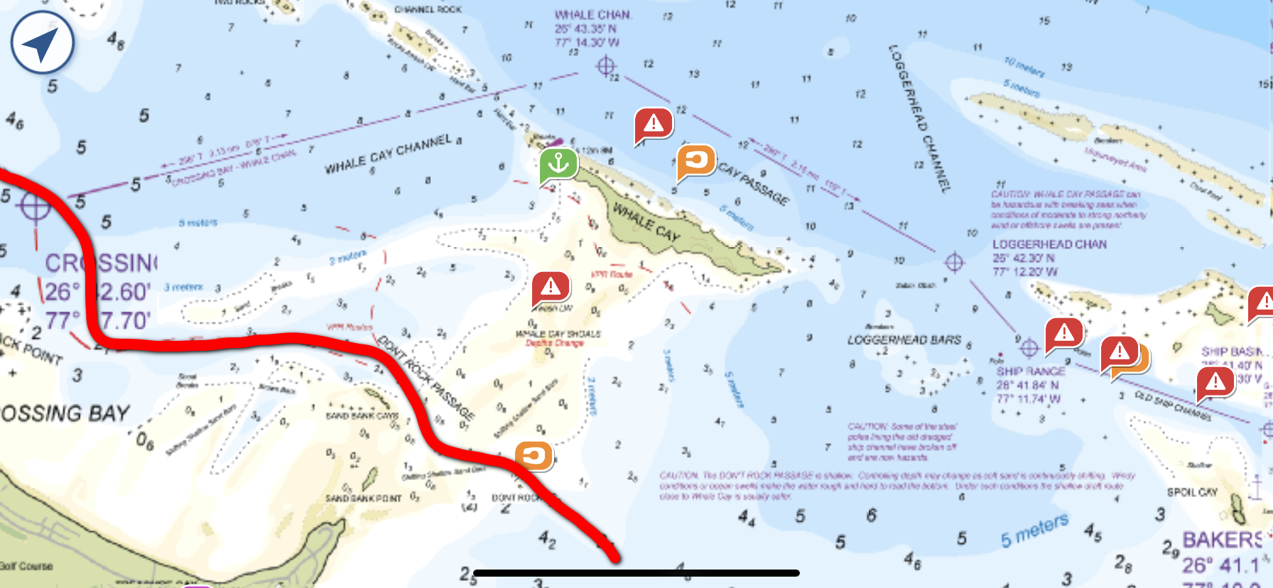 While these photos don’t look so bad … let’s just say we weren’t able to take any photos during the worst! Our boat fortunately took the occasional 5′ breaking wave (white curl & all) all in stride. Due to the intricate route thru the shallow sandbars (see the red line), it was difficult to stay on course and keep the waves to the bow or stern (to avoid broaching). Broached is what a 36′ sailboat did the day before (going outside of Whale Cay) & sunk within 30 seconds. Somehow, they were able to swim to their dinghy (they were towing it?) & were fortunately rescued by a 60′ trawler which diverted to save them.
