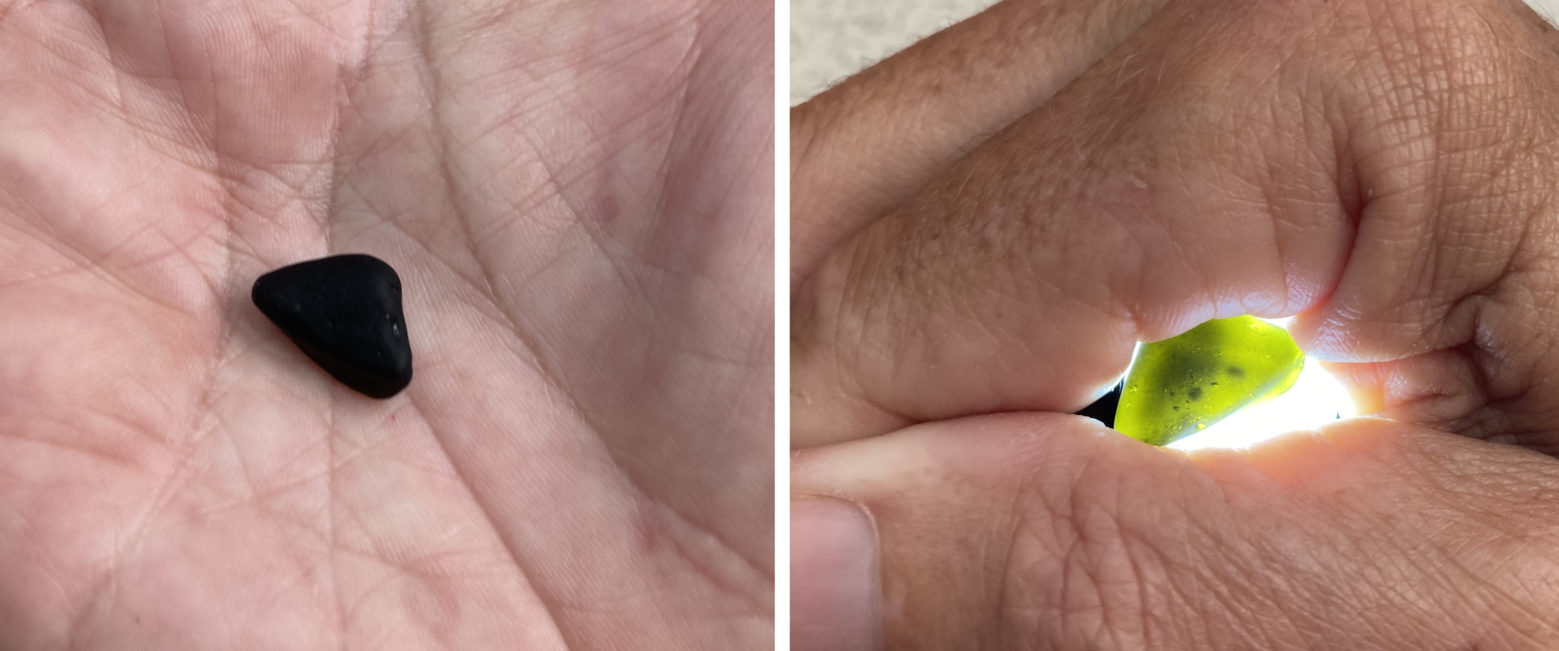 Lori found this “black rock” while sea glass hunting & almost threw it back, but she knows her stuff! A bright light indicated it was possibly very old glass back from when pot ash was used to make glass. The glass started off as green and turns black over the centuries.