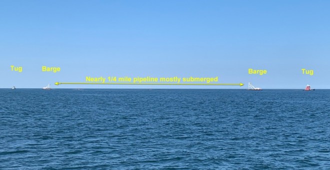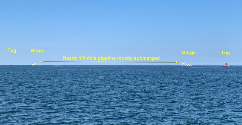 Always something unusual offshore. Off New Jersey we saw 2 tugboats following each other going 2.1 knots on AIS. When we passed them, it made more sense – they were towing 2 barges with almost 1/4 mile of mostly submerged pipeline between them, with no flags or markers at all.