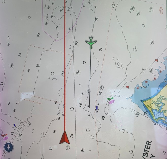 An approaching … airplane?!? The tug transporting a fuel barge apparently mis-programmed their AIS signature to a “WIG – Wing-in-Ground” vessel, which our AIS receiver shows as an airplane symbol.