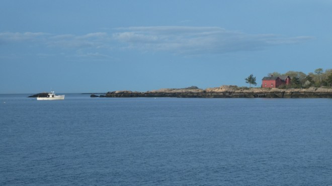 The Maine coastline? No, a view of a Branford, Connecticut former farm where we anchored one night. There are hardly any lobster boats left anymore, but one happened to come by for his photo.