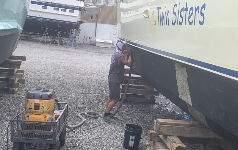 One of our least favorite things … hauling out every 2 -3 years. This was our first for our Manta powercat & while our bottom paint was holding up o.k., our rudder seals (which keep the water out from the rudder shafts thru the bottom) were leaking & as you can only put off the bottom painting just so long… Just do it!
