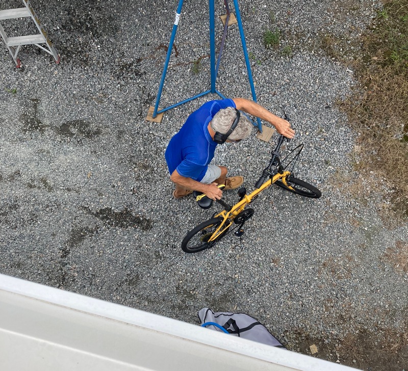 After lowering my folding bike with a rope the 10′ onto the ground, I was off to pick up a few groceries at the Deltaville IGA.