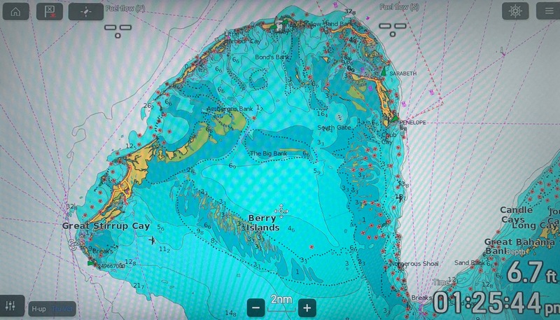 It cost us $400 to Bahamian Immigration just to extend our stay for (what ended up as) only 1 1/2 days. Leaving Spanish Wells we had hoped to head south to spend a week in the Exumas. Pass – several windy days forecasted including some with strong west winds (not much west protection available). Rock Sound for a week, then Exumas – worth it? In the end, we decided to head west to the Berry Islands as we haven’t explored there recently & it was at least in the direction of our eventual return to Florida. A bonus was that the Great Harbour Cay Marina offers nice protection & is reasonably priced so we could hide at during the cold front. Rather than zoom right to the marina, we (I) wanted to first spend a day or two exploring. As the forecast became more severe, we decided we’d better make marina reservation, but too late – now full with a waiting list 😦