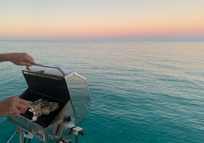 Fortunately his distant cousin did make it onto my grill (grouper fillet bought in Spanish Wells). Very calm seas before the cold front.