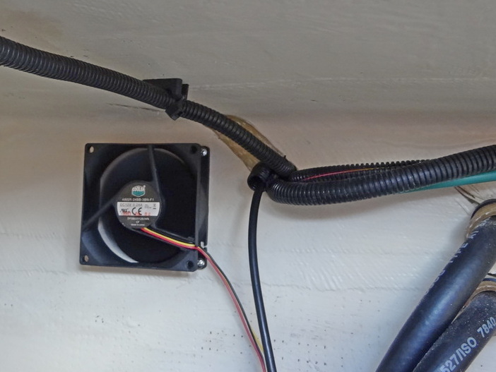 I have my pancake fan wired to operate 24/7, as the power usage is tiny. This little fan actually performs 4 tasks: Removes the hot air from behind the fridge, removes any garbage odors from under the fridge (we keep ours there), exhausts that air into the port locker (over diesel tank) to dry our dock lines & then as I removed the access plate to the anchor chain locker, the air continues into the chain locker to keep everything dry & mildew-free. It really moves the air – you can feel the air being exhausted out by the windlass where the chain drops down.