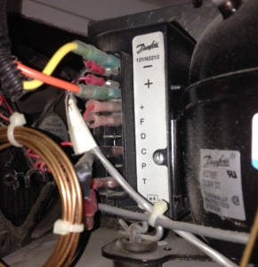 With cabin temps of under 72 degrees, we rarely had a problem, but once hotter, it just couldn’t keep up, especially over 80 degrees. Part of the problem, I’ve been told, is that the single Danfoss compressor is undersized for a combination refrigerator/freezer of this cubic footage. While the first thought might be to have a marine refrigeration technician look at it, I was hesitant. From prior boats, I have found it costs $300.00 – $400.00 with travel fees, etc. to have a tech take a look & perhaps evacuate & re-charge the system, with no guarantee of success. As this fridge is 12 years old & brand new one around $1,200.00 I would almost be inclined to just bite the bullet rather than paying a series of techs to tinker with it. While I would need a marine refrigeration technician to re-charge the system, most sources pointed that was not the problem – in fact, these Danfoss compressors are low pressure systems, which can be tricky even for good tech to re-charge on the first attempt. This dual unit (separate freezer & fridge cold plates) makes it even more challenging.