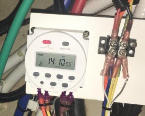 A neat feature of the Danfoss compressor controller is that by simply wiring in a $3.00 LED, you can learn of any faults causing the compressor to stop (low voltage, etc. – there is a chart telling you what the flashes mean). So if this red LED (to the right of the green LED) ever flashes, I can look up the diagnostic code to see what the failure is.