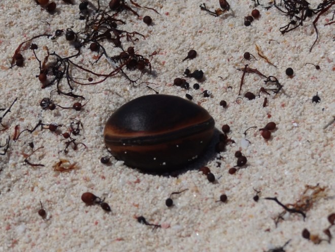 Better than all the T-shirts, trinkets and sundresses calling “take me with you”, was my exciting find on the beach. Nestled in the sand, completely visible near some dried sea kelp, was a hamburger bean. The one and only sea bean that turned up, but now I have a collection of two sea beans!