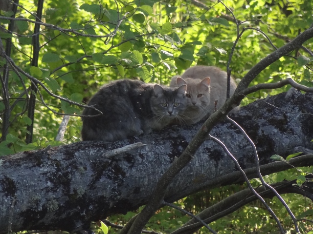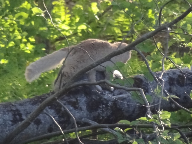 That same evening, there we sat at our tiny dinette table, sipping our Happy Hour libations and minding our own business. We sat inside because thanks to a cold front, the day was chilly, chilly and windy, windy. You get the picture. Our window looks out toward…….. not much, just open space, a barn, a few trees (one fallen) and grassy tent sites beyond. Movement caught my eye and I saw what looked like large, furry cat-like creatures; two of them.