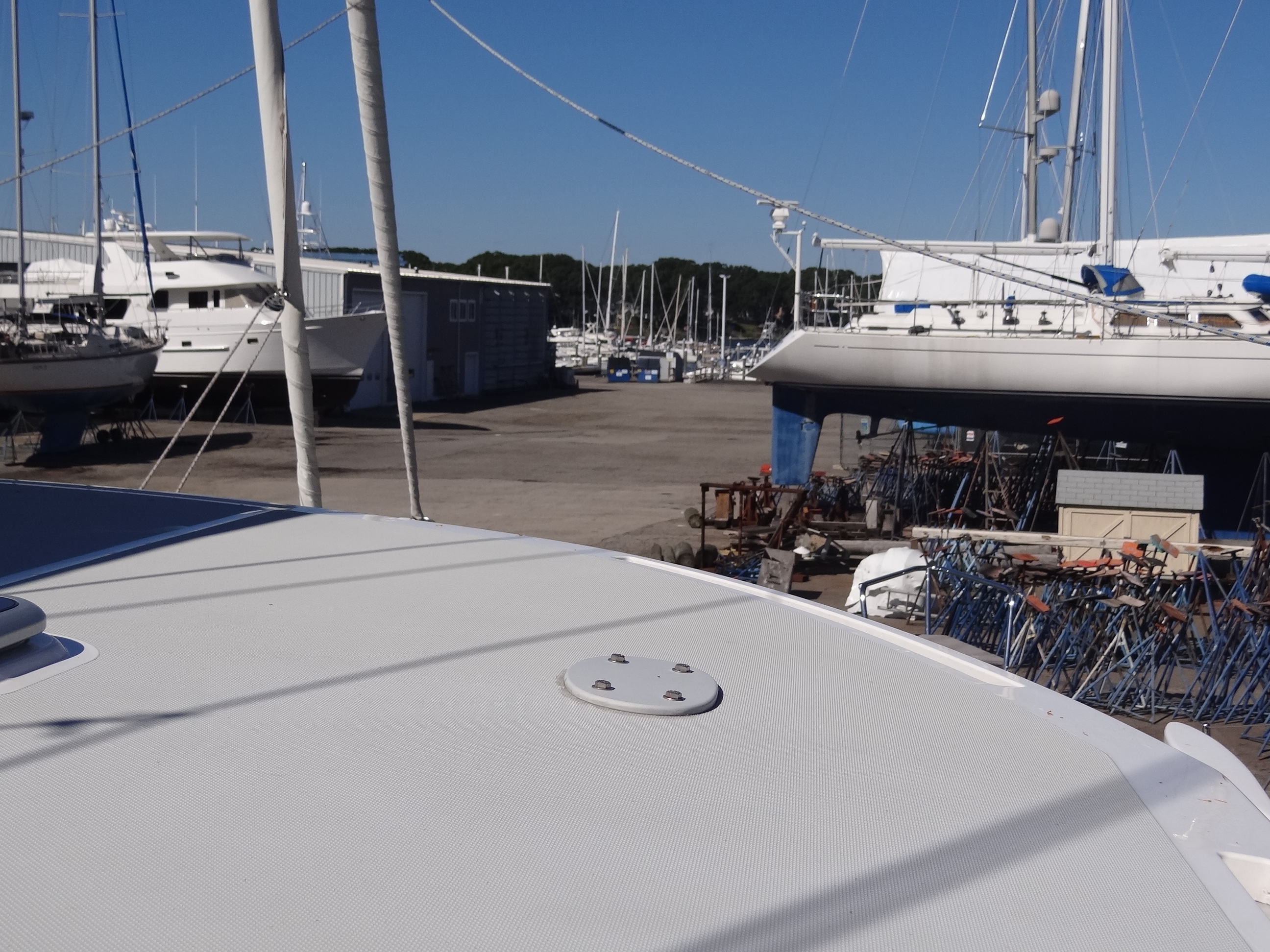 Another itsy bitsy teeny weeny yellow polka-dot bikini day. Thanks to plenty of white puffy clouds our temp display reads 89 now instead of 92,- Ok- make that 94 now in the sun. I read the background story about the song; Paul Vance wrote it in 1960 about his two-year-old daughter and Brian Hyland took it to #1 that summer. I was two in 1960; don’t think my swim suit collection included a bikini. We’ve ended up retrieving Bonny, Ms Escape Pod #1, from our CT marina. Borrowed a ladder from David (not buying anything more that we have to store!) to allow us extreme ease in getting off and on the boat and also for working along the edges of the deck. Our big project this summer is removing all the deck hardware and fittings, grinding out a bit of coring, filling with epoxy, then re-installing the machine screws with proper sealant. When the hardware was off we cleaned off the rust. The end result, assuming we don’t expire from the heat, will be that water can no way get in to the core-cell and no way will we have rusting.