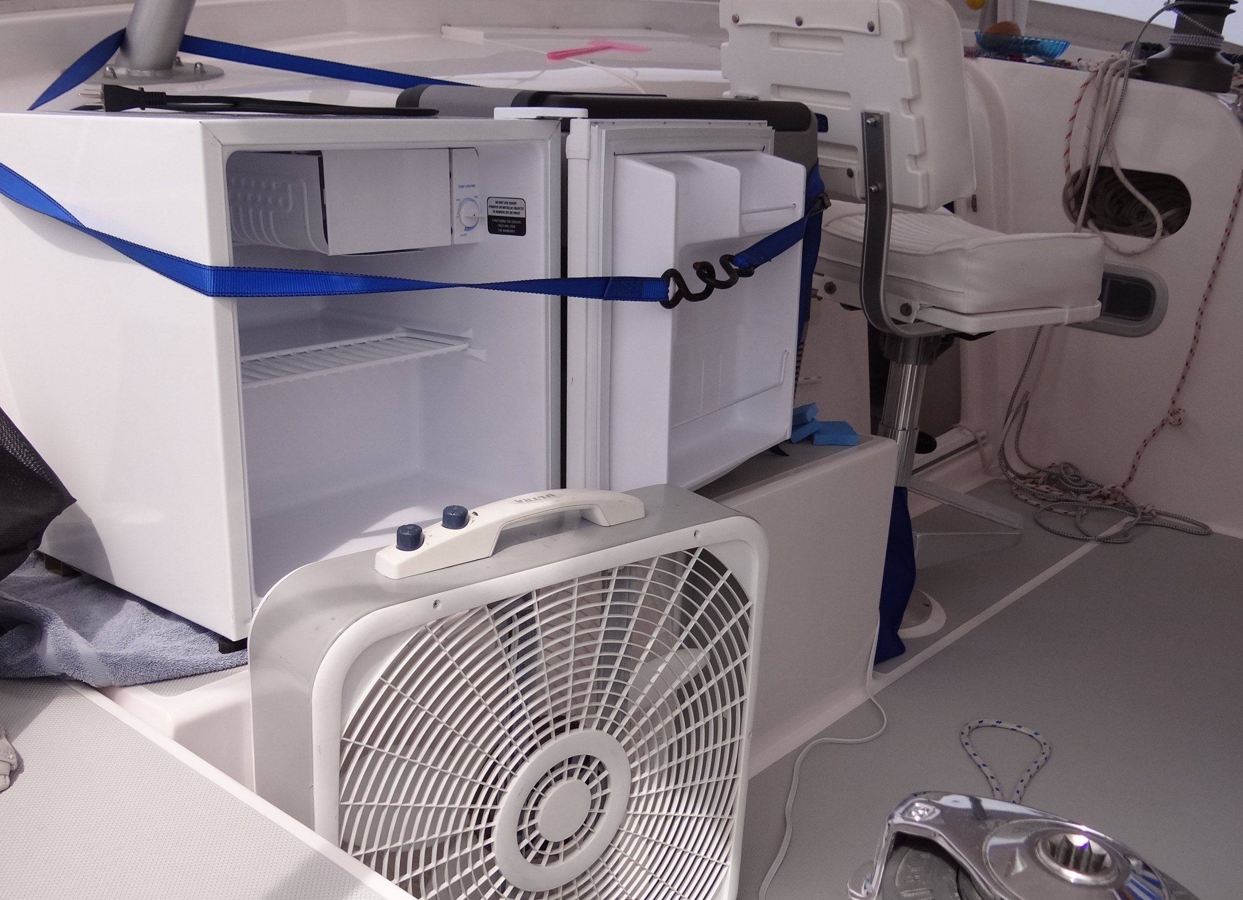 Cockpit Left: fridge and freezer, box fan. Ready to cool the food and us!