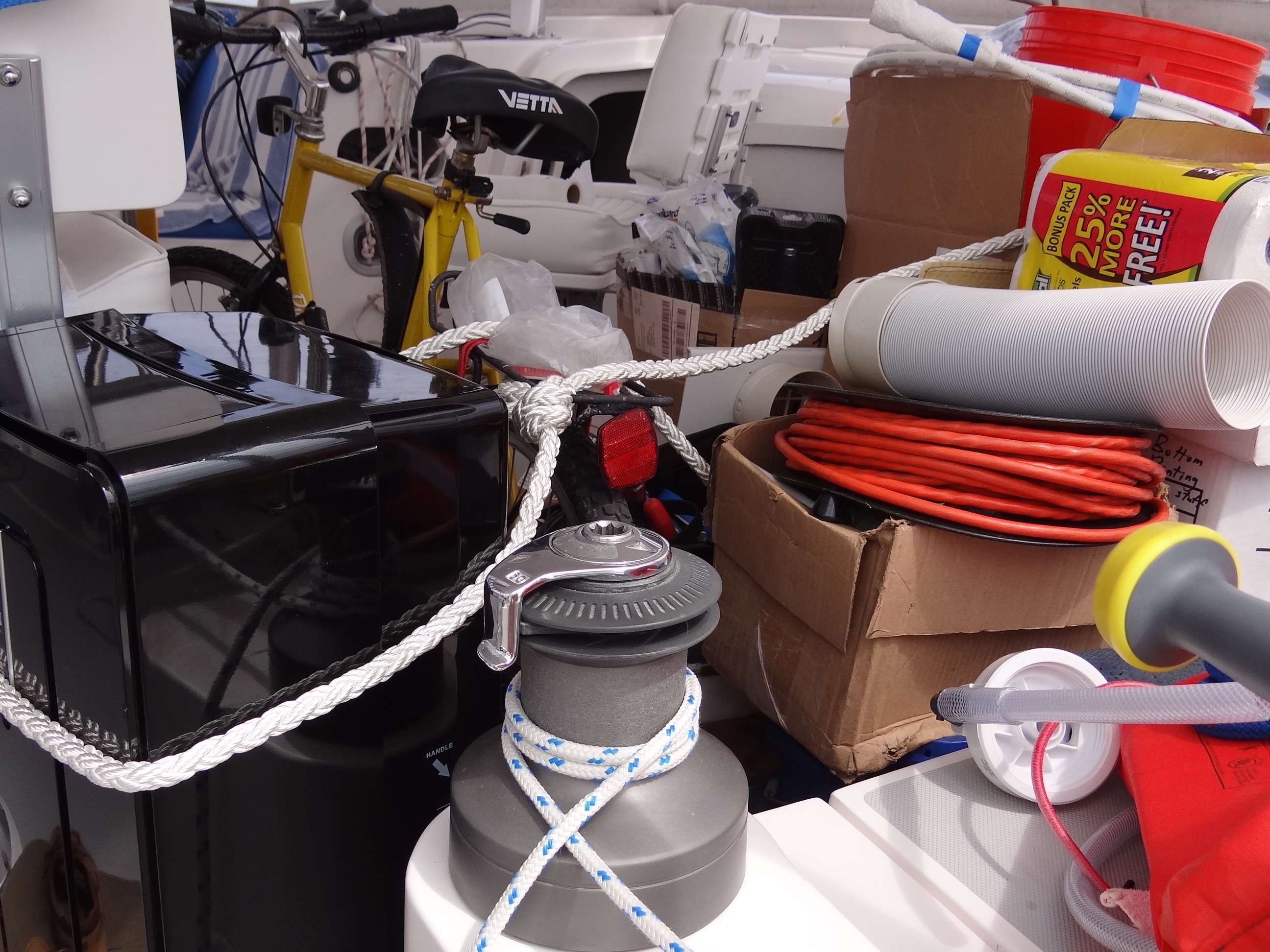 Cockpit Right: Portable AC unit secured with new anchor rode, bike, tools and more!