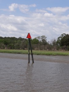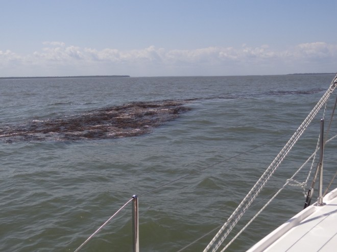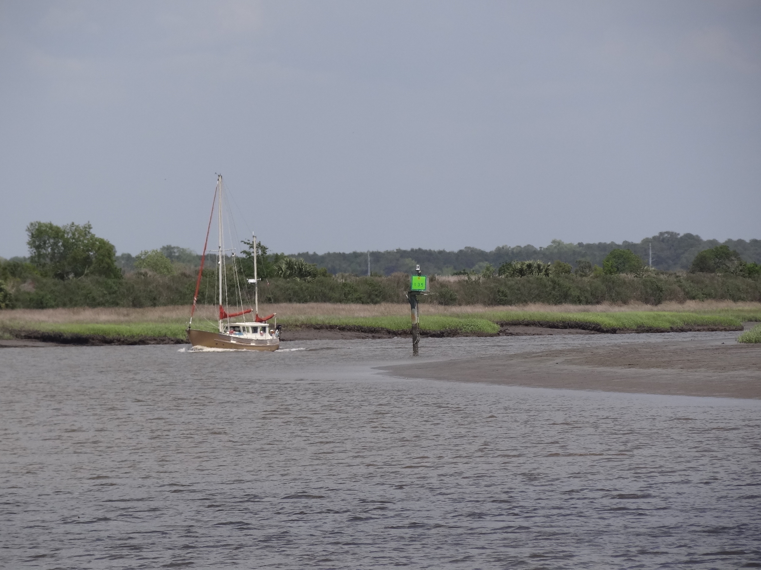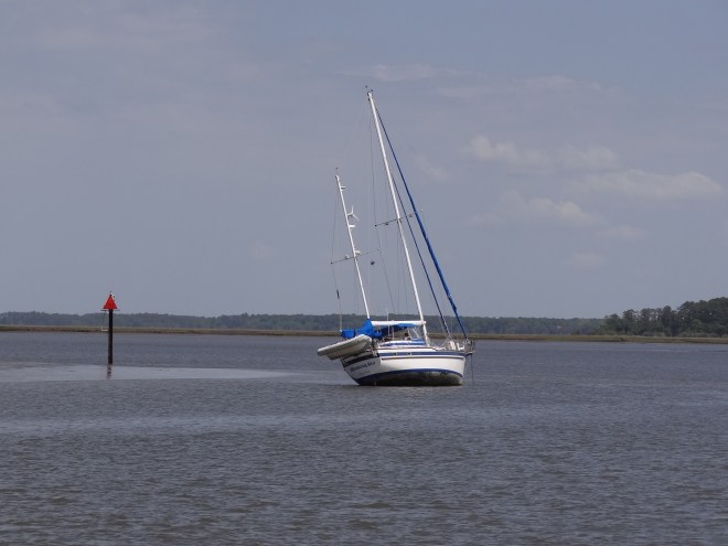 So back to the tides and currents: A+ on the currents and D- on having us transit a much shoaled-in stretch at low tide. Mucho thanks to ActiveCaptain and the hazard markers that warned us and told us how to proceed; to the vessels ahead of us; and to our minimal 3ft draft. With a tidal range of 6-7ft from roughly the St John’s River through much of South Carolina, the absence of deep draft boats is as noticeable as is the presence of comments such as, “gee how’d you like that Amelia River stretch?” In all fairness to the captain, we really didn’t have much choice in where we were and when that day and s/v Cat Ching (get it?) zoomed along fine using his path from last fall. Cheater 🙂